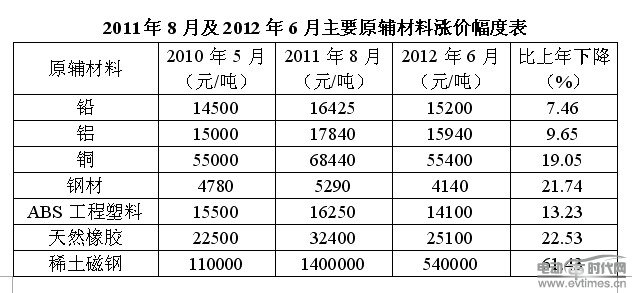 在6月8日剛剛結(jié)束的江蘇協(xié)會五屆五次理事會議上,江蘇省自行車電動車協(xié)會理事長陸金龍指出,雖然不提倡電動車行業(yè)的價格戰(zhàn),但從外部環(huán)境看,價格戰(zhàn)的環(huán)境已經(jīng)形成。從去年8月份至今年6月影響電動車成本的鉛、鋁、銅、鋼材價格分別下跌7.46%、9.65%、19.05%、21.74%,ABS工程塑料、天然橡膠價格分別下跌13.23%、22.53%,稀土磁鋼價格下跌61.43%。